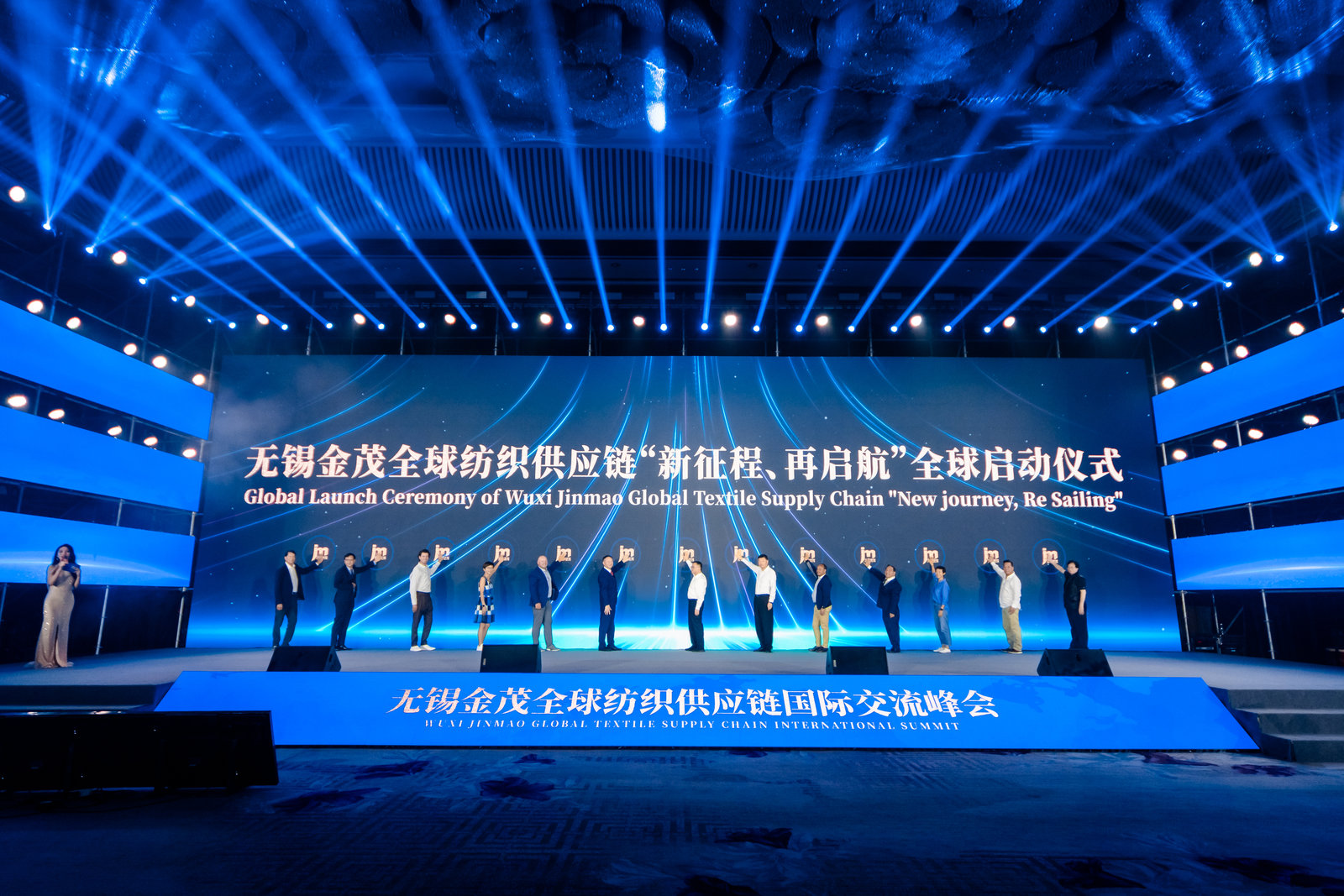 At the global launch ceremony of the "New Journey, Sailing Again" global textile supply chain in Wuxi Jinmao, Mr. Zhao Qiang, Director of the Wuxi Municipal Bureau of Commerce, Mr. Chen Ximing, Deputy Secretary of the Liangxi District Committee and Director of the Standing Committee of the District People's Congress, Mr. Yang Nan, Chairman of Wuxi Jinmao Foreign Trade Co., Ltd., as well as representatives from the United States, Hong Kong, the United Kingdom, Ethiopia, Singapore, Vietnam, Guatemala, Cambodia, Bangladesh Representatives from India took the stage together to participate in the launch ceremony and witness the exciting moment when the global textile supply chain of Wuxi Jinmao was officially launched!